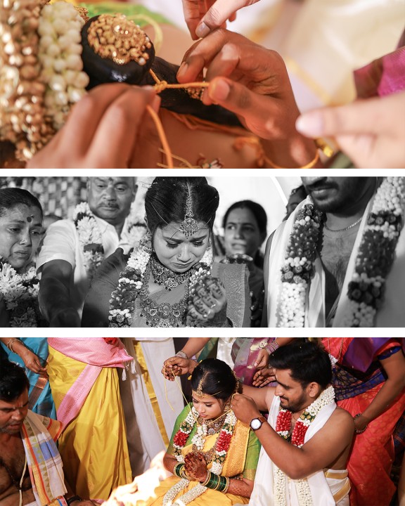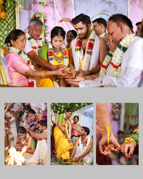 The Muhurtham moment was profound. As the sacred chants echoed and the flames danced, Aravind tied the thaali around Maha’s neck, sealing their bond with tradition and emotion. Tears welled up in Maha’s eyes—not just from overwhelming joy, but from the deep realization of entering a new chapter of life. Surrounded by their families, the couple exchanged heartfelt vows in silence, their hands tightly clasped, promising love, respect, and togetherness. It was more than a ritual; it was the heartbeat of their wedding story.