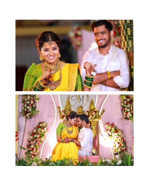 The wedding of Aravind and Maha was rooted in the richness of Tamil culture. Maha adorned a traditional green and mustard yellow Kanjivaram saree, intricately woven with golden zari, while Aravind wore a crisp white veshti and shirt, embodying classic elegance. The décor echoed temple-inspired architecture with hues of gold, maroon, and soft floral tones, creating a divine ambiance. Every ritual, from the nalangu to the kanyadaanam, reflected deep cultural values, tying their modern love story to age-old traditions with pride and reverence.