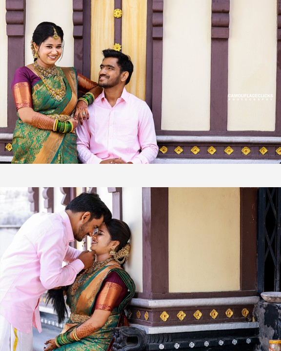It’s the quiet glances and spontaneous laughter that reveal the true essence of love. Throughout their wedding, Aravind and Maha were constantly caught in the magic of these unscripted moments—him adjusting her necklace with care, her whispering a joke during rituals, and their shared joy as they looked at each other amidst the ceremonial chaos. These heart-melting candids are what made their wedding truly intimate. Every frame clicked by Camouflageclicks told a story beyond just poses; it captured their genuine chemistry and emotional connection.